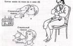 4. Усадить ребёнка на стул или на колени помощнику. Помощник усаживает ребёнка к себе на колени, удерживая ноги своими скрещенными ногами, голову фиксирует одной рукой за лоб, другой обхватывает руки.